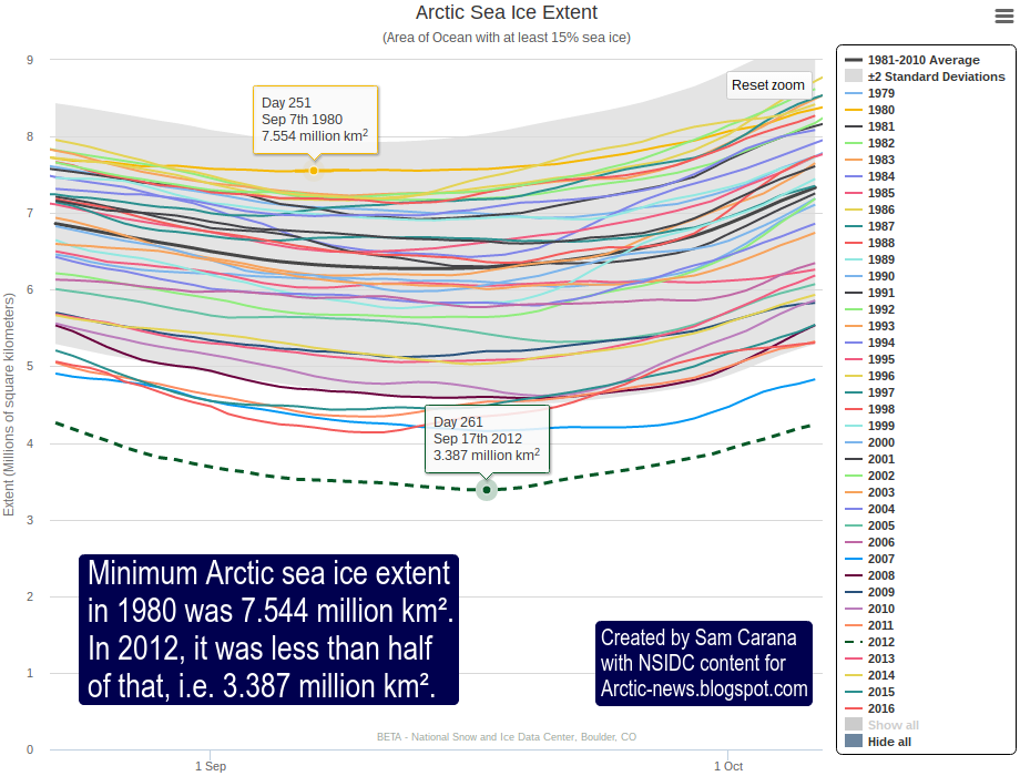 To put this 2.615 million km. in perspective, the minimum Arctic sea ice in 2012 was 3.387 million km., 4.157 less than the minimum extent in 1980, as illustrated by the image on the right.