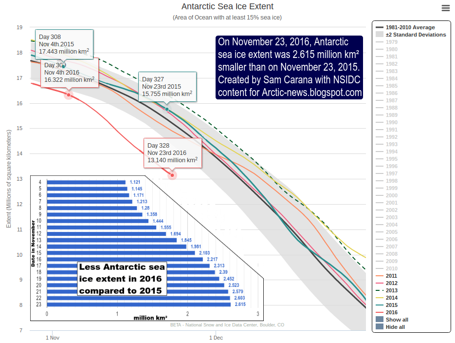 For years, global warming was also thought to be held back by growth of sea ice around Antarctica and the greater albedo resulting from that. Recently however, sea ice around Antarctica reached record low extent for the time of the year (late 2016). On November 23, 2016, Antarctic sea ice extent was 2.615 million km. smaller than it was on November 23, 2015.
