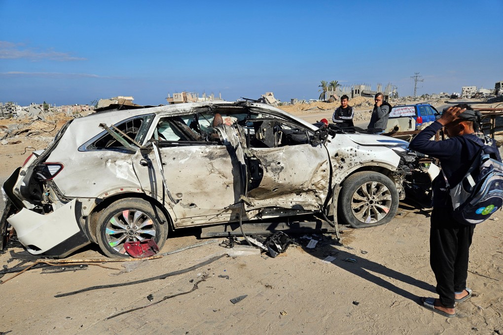 A vehicle for the World Central Kitchen sits charred in the central Gaza Strip after an Israeli strike, on April 2, 2024